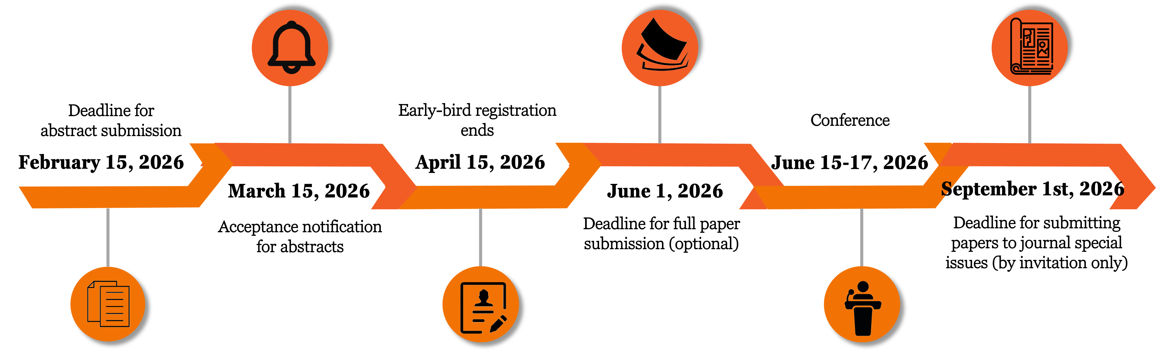 January 15, 2026February 15, 2026: Deadline for abstract submissionFebruary 15, 2026March 15, 2026: Acceptance notification for abstractsMarch 15, 2026April 15, 2026: Early-bird registration ends (at least one author should register before Early Bird ends; otherwise an accepted abstract will be removed from the conference program and not be considered for journal special issues; an author can only register for no more than two accepted presentations)May 15, 2026June 1, 2026: Deadline for full paper submission through the conference system (optional)- June 15-17, 2026: Conference